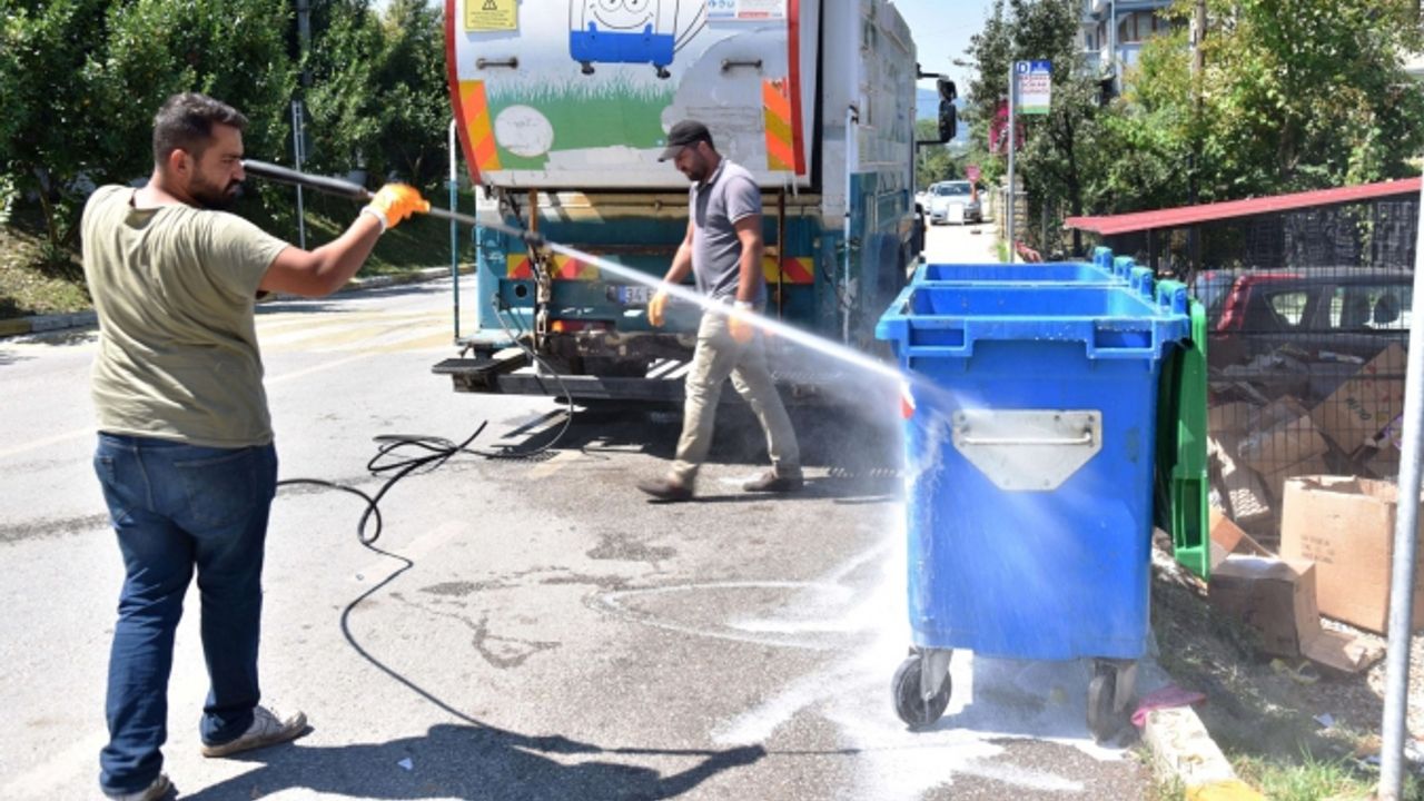Kartepe Belediyesi Temizlik İşleri Müdürlüğü ekipleri mahallelerde bulunan çöp konteynırlarını, çöp toplama ekibi ile eşzamanlı olarak bulundukları yerde çöpleri boşaltıldıktan sonra yıkama aracı ile yıkayarak ediyor ve Covid-19’a karşı tedbirlerini sıkılaştırıyor.
