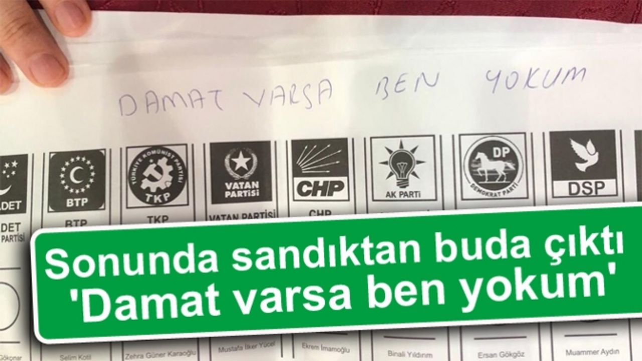 Sosyal medyada paylaşılan fotoğrafta bir seçmenin, oy pusulasında AKP logosunun olduğu yere “Evet” yazıp pusulanın üstüne de “Damat varsa ben yokum” ifadelerini yazdığı görüldü.